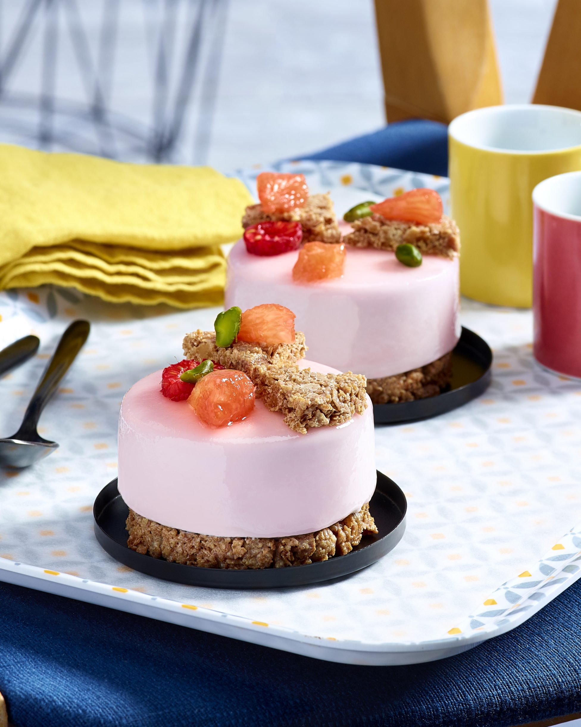 Glacer le cylindre de mousse Philadelphia (avec insert) avec le glaçage pamplemousse à 30°C, déposer de suite sur le palet de biscuit cheesecake croustillant. Terminer le petit gâteau avec un rappel de biscuit croustillant, un segment de pamplemousse frais, une ½ pistache et éventuellement une framboise taillée.