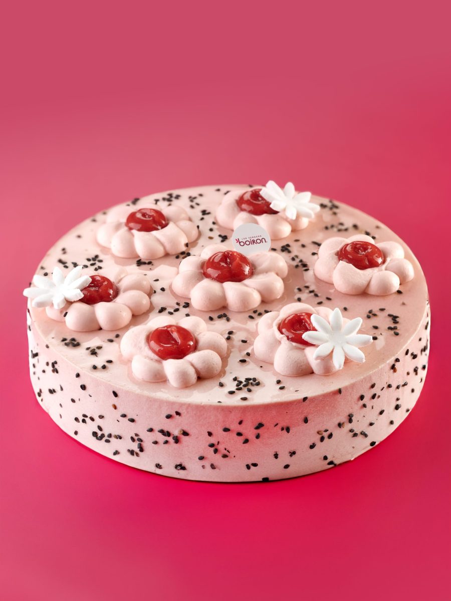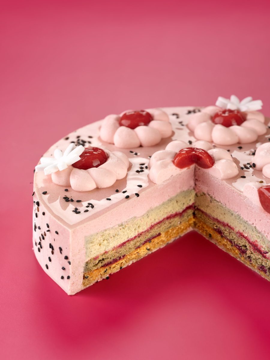 Dans un cercle de 20 cm de diamètre et 4,5cm de haut, couler environ 600 g de mousse rhubarbe rouge puis l’insert de 18 cm de diamètre composé d’un disque de croustillant sésame, de biscuit sésame citron et le crémeux sudachi sésame. Lisser.