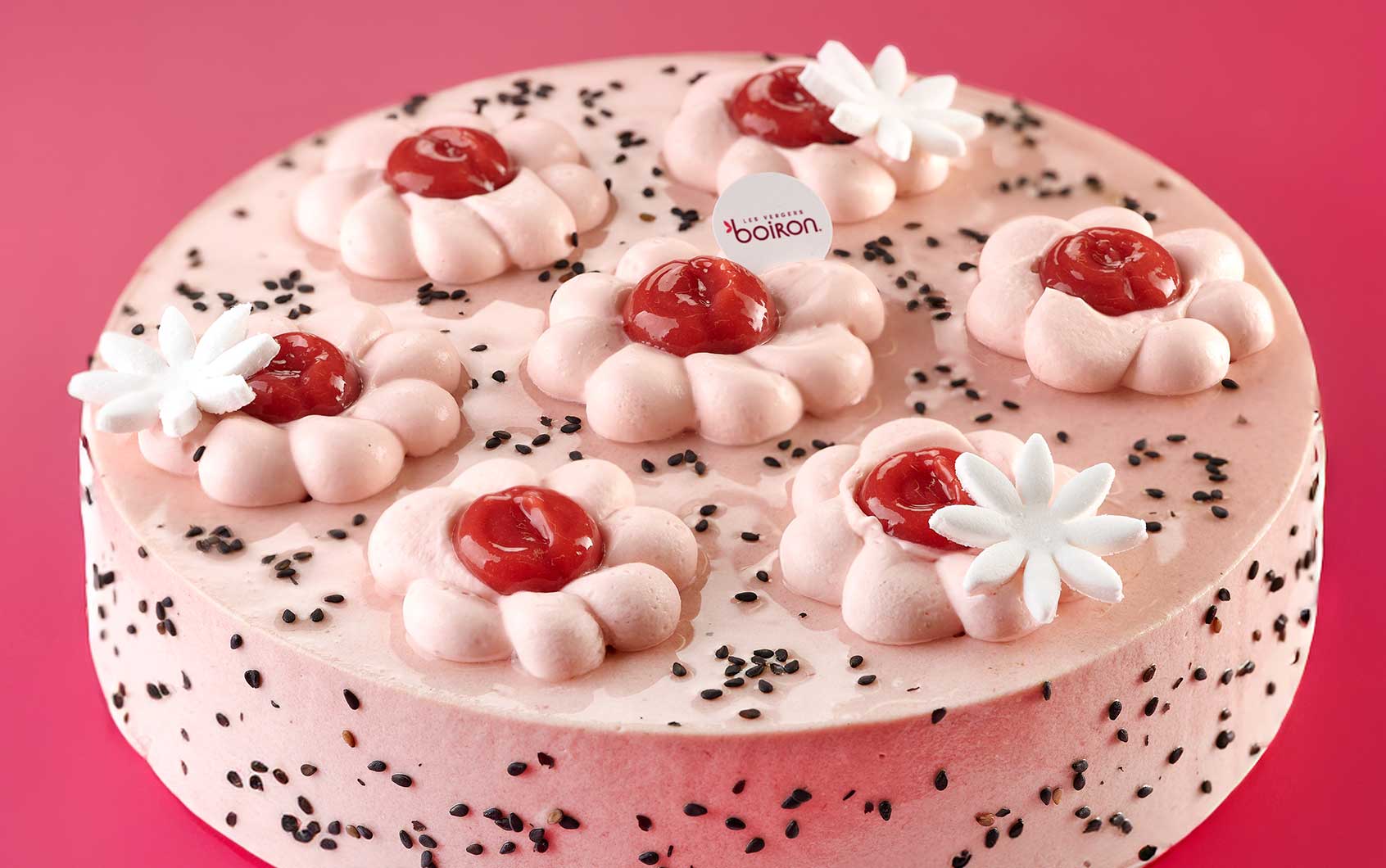Dans un cercle de 20 cm de diamètre et 4,5cm de haut, couler environ 600 g de mousse rhubarbe rouge puis l’insert de 18 cm de diamètre composé d’un disque de croustillant sésame, de biscuit sésame citron et le crémeux sudachi sésame. Lisser.