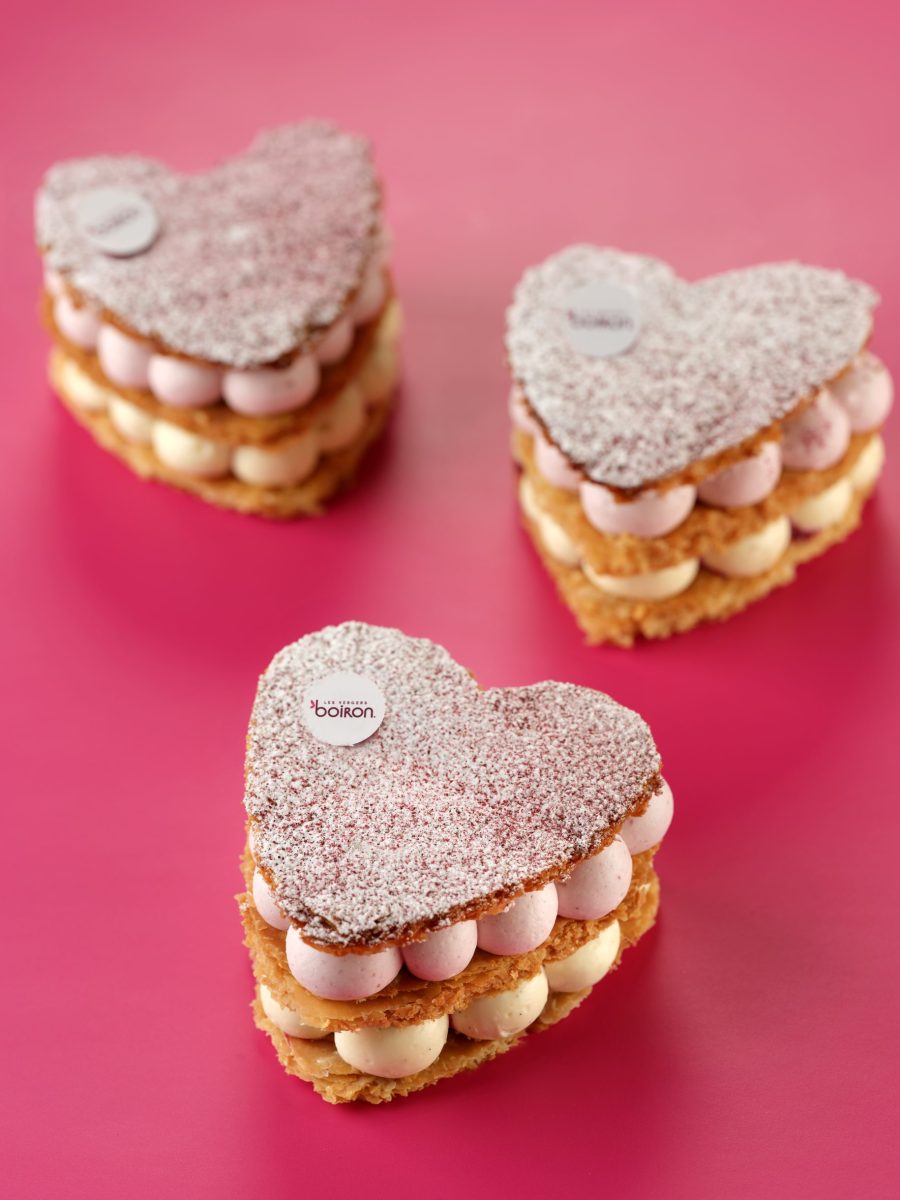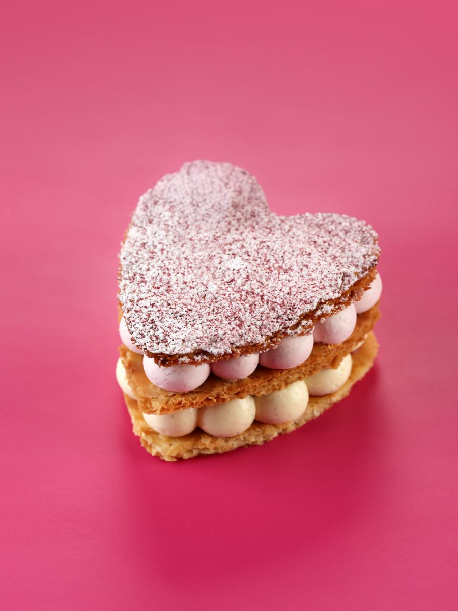 Pocher sur la périphérie du 1er cœur de feuilletage la crème diplomate vanille puis venir disposer de la compotée de fruits rouges au centre et venir déposer le 2ème cœur de feuilletage.