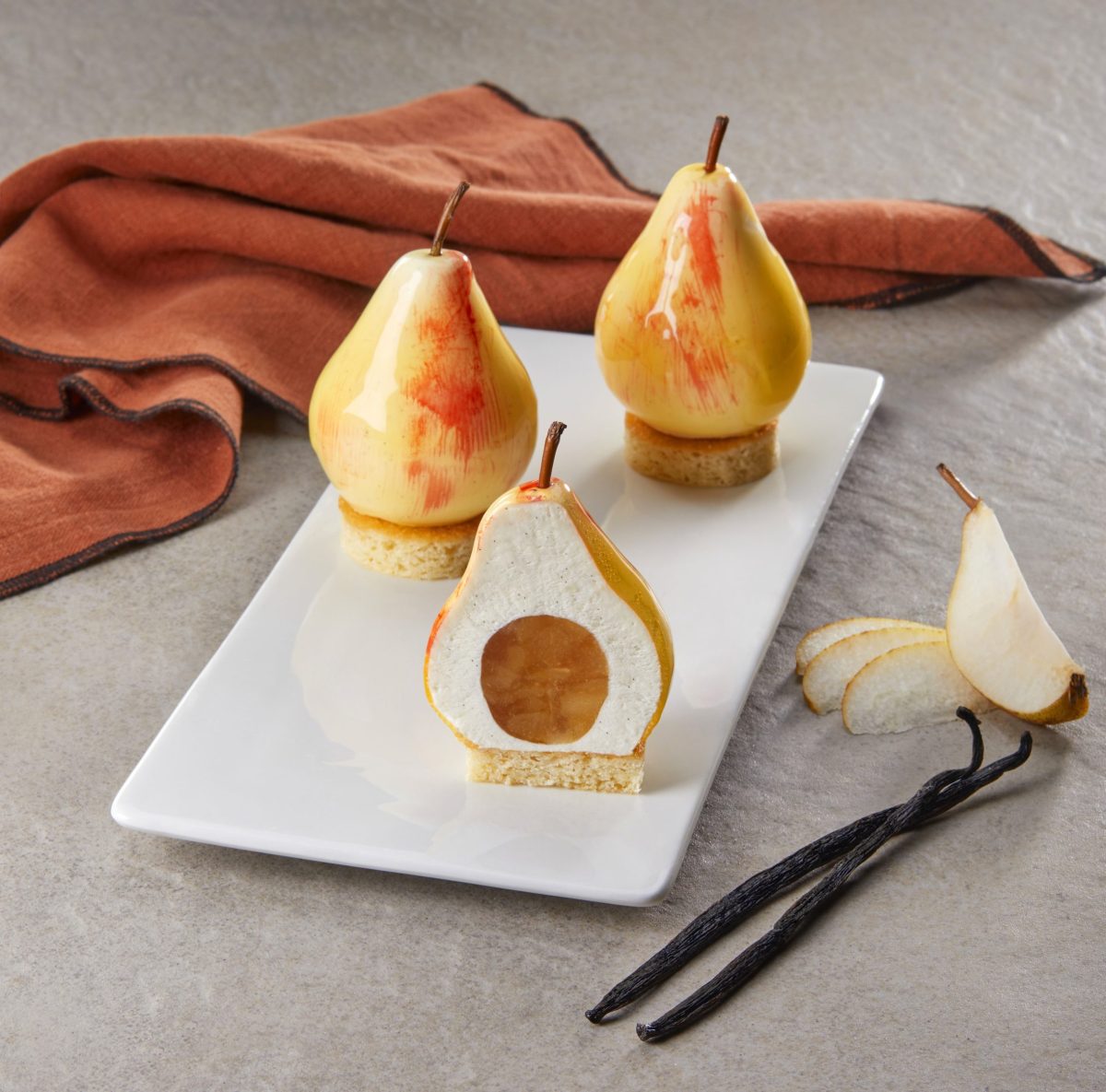 Remplir aux ¾ les moules de bavaroise à la vanille Bourbon. Insérer dans chaque moule, deux dômes de fourrage poire façon Tatin apposés l’un contre l’autre pour former une boule.