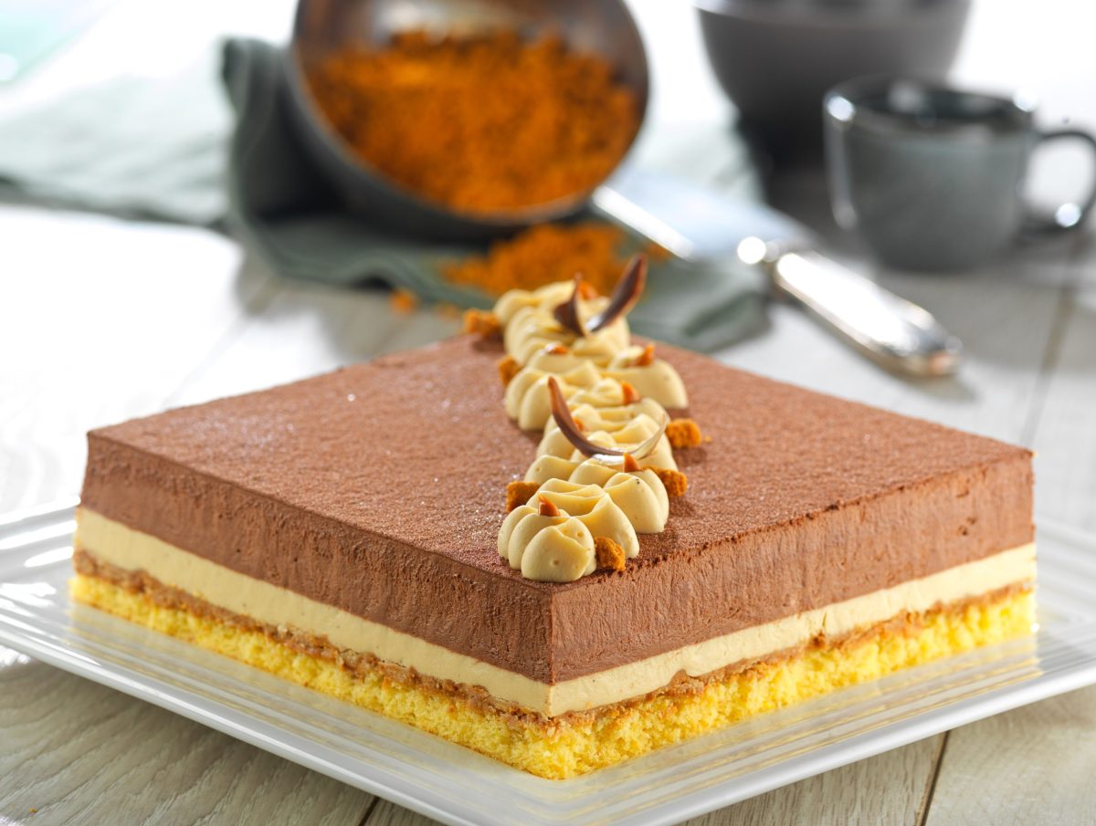 Un entremets gourmand réalisée avec le croustillant spéculoos, une pâte qui allie la douceur du chocolat blanc aux notes épicées du spéculoos