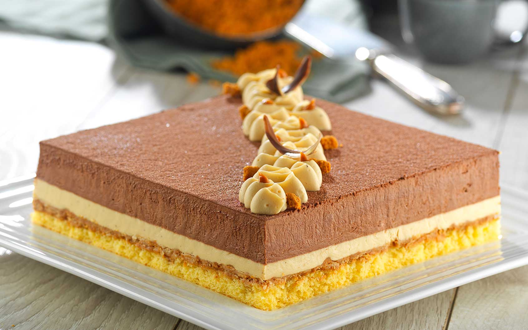 Un entremets gourmand réalisée avec le croustillant spéculoos, une pâte qui allie la douceur du chocolat blanc aux notes épicées du spéculoos